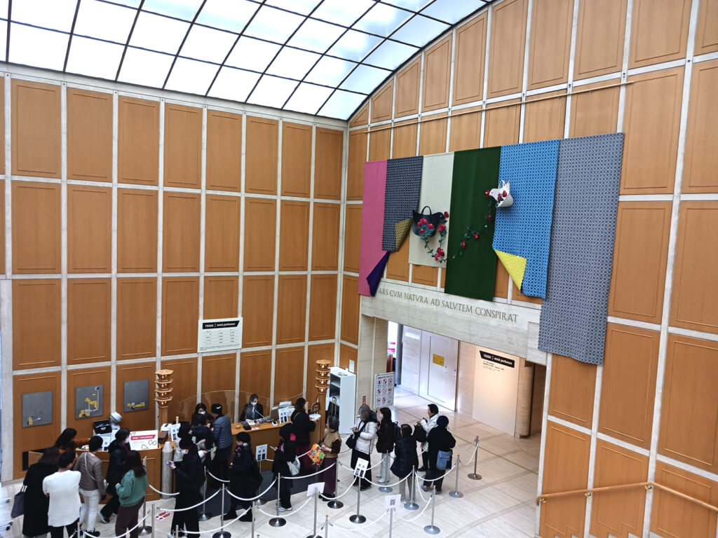 つぐ展には1月後半の平日に行きましたが混雑状況はまあまあ観やすい状態でした。世田谷美術館は初めてで周辺の様子も分からないため、まずはランチ確保と言うことが優先されるのです。施設内のレストランは展覧会期間中の予約は受け付けないため開店前から並び待つことにしましたが、大きなガラス越しに見る「くぬぎ広場」の晴れた冬の景色が心地よく、レストランまでの回廊は贅沢にも「jardin(2017-18 a/w)」で設えてありました。こんな幸福な空間で待つ時間も時にはギフトです。世田谷美術館内では通路にミナペルホネンファブリックのベンチチェストがあり、展示ブース内だけではなく美術館全体がつぐ展を表現していました。丁寧で行き届いた展覧会であったと感じます。